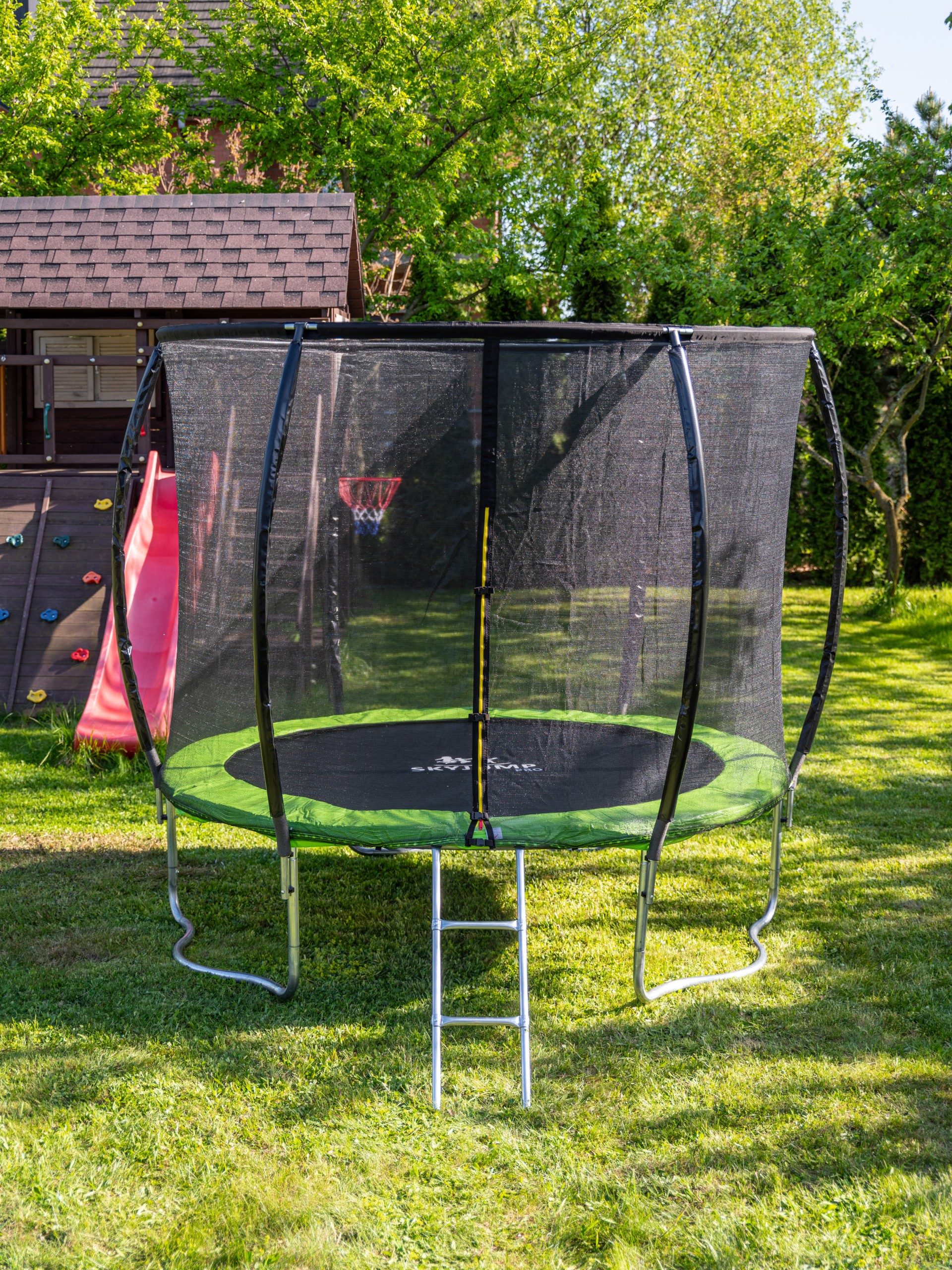Складной батут SKYJUMP (скайджамп) MASTER 2,52 метра с защитной сеткой и лестницей изготовлен в Китае из качественной оцинкованной стали по высоким технологическим стандартам и имеет повышенную устойчивость к воздействию ультрафиолетовых лучей и влаги. Сборка батута проста и понятна, а безопасность прыжков обеспечивает специальная защитная сетка. Подъём на батут осуществляется с помощью устойчивой лестницы от земли до пружинящей поверхности. Качество батутов SKYJUMP гарантируется Китайским сертификатом, который делают для продажи их в европейском союзе.